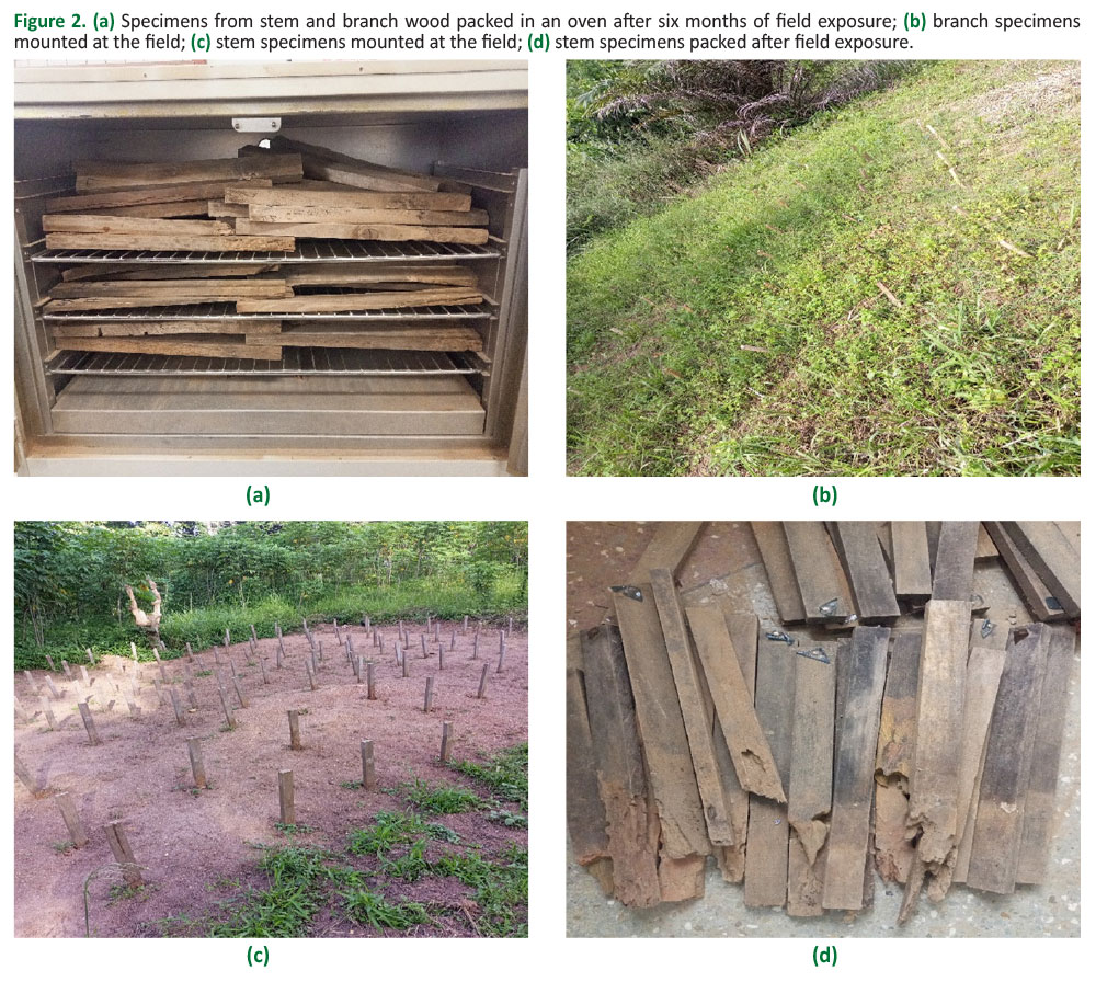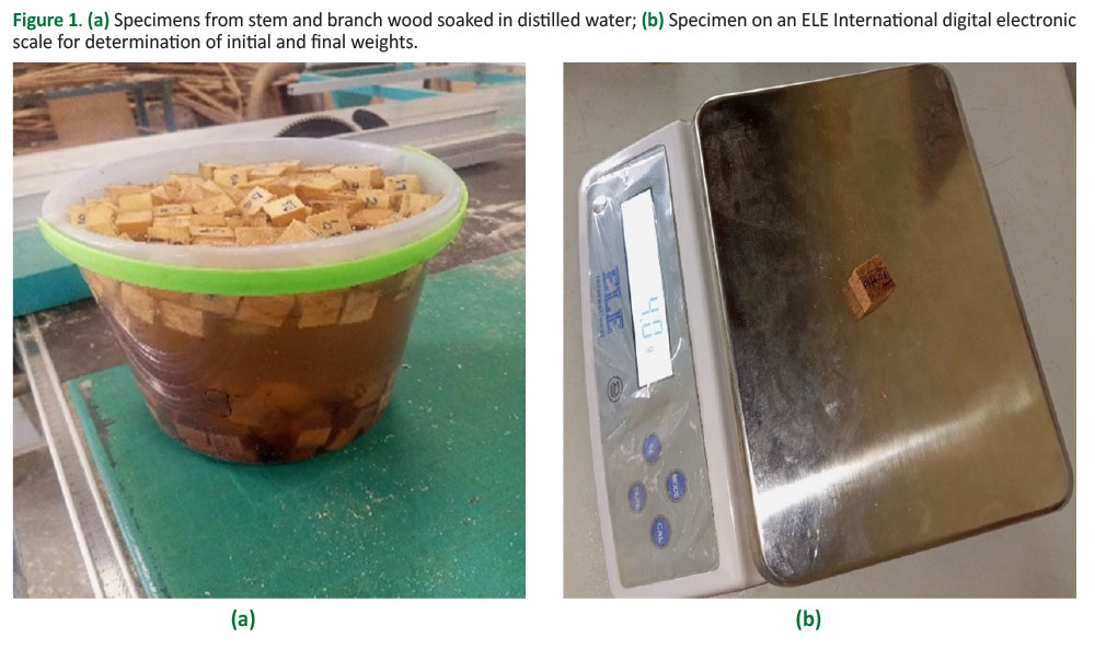 Stem and branch wood specimens measuring 500 mm · 50 mm · 25 mm were prepared and oven-dried at a temperature of 103±2°C, following the guidelines of EN 252 (2014). Drying continued until there was no significant change (≤0.01 g) between two successive weighing. Each specimen was appropriately labeled for easy identification and conditioned to a moisture content (MC) of approximately 10–12%. The initial weights of the specimens were measured and recorded using an ELE International electronic balance.