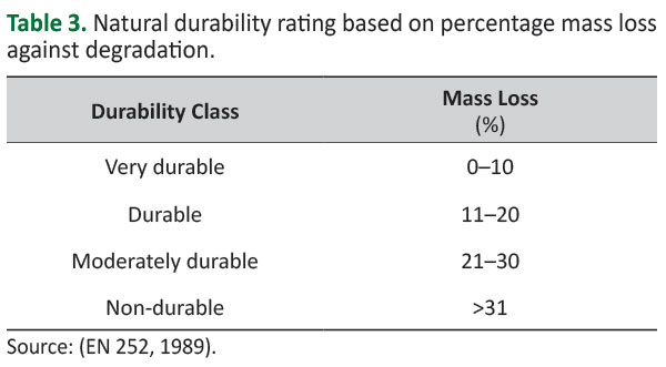 Table 3. Natural durability rating based on percentage mass loss against degradation.