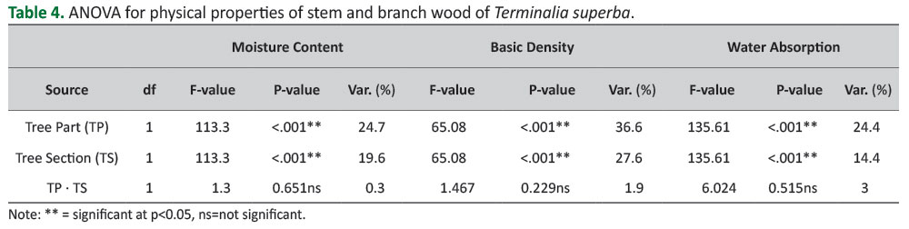 Table 4. ANOVA for physical properties of stem and branch wood of Terminalia superba.