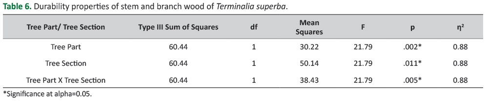 Table 6. Durability properties of stem and branch wood of Terminalia superba.