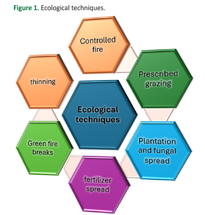 Various contemporary ecological methods are employed to mitigate forest fires. Prescribed or controlled burns are deliberate, closely monitored low-intensity fires initiated with the aim of mitigating the risk of wildfires by minimizing the presence of hazardous fuels, such as dead vegetation and underbrush. This strategy can mitigate the challenges faced by firefighters in controlling wildfires by revitalizing ecosystems, promoting the establishment of fire-adapted species, and modifying future fire behaviour (Brodie et al. 2024, Krishnambika et al. 2024, Wang et al. 2024). Strategically implemented sections, referred to as "fuel breaks", disrupt the uninterrupted expansion of combustible vegetation and effectively reduce or extinguish fires. Implementing practices such as tree thinning, undergrowth clearance, and the protection of open spaces around infrastructure and communities in areas prone to high-risk situations are effective methods for their construction. Fuel stops provide firefighters with additional time to respond and protect vulnerable areas (Krishnambika et al. 2024, Wang et al. 2024). Implementing a deliberate tree spacing and thinning approach can effectively mitigate excessive growth and impede the progression of wildfires. Forest managers engage in brush clearing and tree spacing activities based on projected canopy dimensions in order to establish defensible areas, as excessive growth of trees, shrubs, and other plants can be susceptible to combustion. As a result, fires have a reduced likelihood of spreading and may be extinguished more rapidly (Brodie et al. 2024, Crockett and Hurteau 2024, Kokosza et al. 2024, Zald et al. 2024). Ensuring the prevention of wildfires necessitates the presence of forests that are in good health and possess the ability to recover quickly. By introducing tree species that possess greater resistance to disease, drought, and fire, forests become less susceptible to devastating fires. Research by Sharon Hood et al. provides a comprehensive assessment of the many tree species in the Northern Rockies, focusing on their ability to adapt and regenerate in the aftermath of fires. The research emphasizes that particular species, such as ponderosa pine and western larch, exhibit exceptional fire resistance due to their large root systems and thick bark (Hood et al. 2018). According to (Alberta Government. 2012 aug 03) deciduous trees like trembling aspen can act as natural firebreaks, slowing fire spread due to their higher moisture content and different structural properties. Moreover, encouraging variety and avoiding monocultures increases the overall resilience of ecosystems (Shuhui et al. 2024, Speck and Speck 2024, Rhodes 2024). The utilization of livestock, specifically sheep and goats, for planned grazing can effectively mitigate the usage of detrimental fuels. Ruminants devour the vegetation such as grasses and bushes which is capable of igniting fires (Batcheler et al. 2024, Karp et al. 2024, Kerns and Day 2024, Schachtschneider et al. 2024). Mechanical methods, such as masticators and mulching machines, are used to decrease the density of plants and establish defensive areas (Calderon et al. 2024, Harrower 2024). Utilization of litter layer to grow mushrooms has also been found as a key factor to prevent wildfires, since fungal spread on the litter layer has several benefits such as nutritional cycling (Wade and Lundsford 1990, Adams and Neumann 2023), soil structure improvement (Hopkins et al. 2021, Adams and Neumann 2023), fire resilience (Hopkins et al. 2021, Espinosa et al. 2023), pest and pathogen control (Espinosa et al. 2023). Some studies used fertilizers on litter layer and achieved some outstanding results which are very effective in wildfire prevention such as: accelerated decomposition, promoting beneficial microbial activities, nutrient enrichment, improved soil quality and encouraging vegetation cover (Ferreira et al. 2015, Girona-García et al. 2021, Agbeshie et al. 2022, Song et al. 2022, Adams and Neumann 2023). Strategically positioned patches of vegetation that are resistant to fire are referred to as "green fire barriers" or "green firebreaks". They are employed to hinder or postpone the propagation of wildfires, especially when they are in proximity to buildings and other structures. Compared to traditional firebreaks, they are a more ecologically sustainable choice since they do not eliminate all organic matter until they reach mineral soil (Warnell et al. 2023). The primary goal of green fire barriers is to disrupt the continuity of flammable vegetation, thus reducing the severity of a fire. Planting low-flammability species can effectively decrease the amount of flammable material, thus slowing down the spread of flames. Studies have demonstrated that places with well-managed green firebreaks exhibit reduced severity and aggression of fires when compared to untreated areas (Li et al. 2024, Murray et al. 2024, Wang et al. 2024). Green fire barriers that employ indigenous plants with minimal flammability also promote biodiversity. By safeguarding indigenous plant species and providing habitats for wildlife, these barriers can contribute to the preservation of ecological balance. Strategically planting a diverse range of species can help to replace invasive plants that may increase the likelihood of fire (Weir et al. 2012, Ascoli et al. 2023, Warnell et al. 2023). Green fire barriers, particularly when positioned along topographic contours, can mitigate erosion and enhance soil stability. Fire activity can exacerbate the risk of erosion following intense rainfall, and vegetation roots play a crucial role in soil stabilization. This ecological advantage is particularly noteworthy in areas where wildfires frequently result in soil degradation (Warnell et al. 2023). These barriers offer protection to residents in places where urban areas meet wilderness areas. These barriers serve to safeguard homes from approaching f