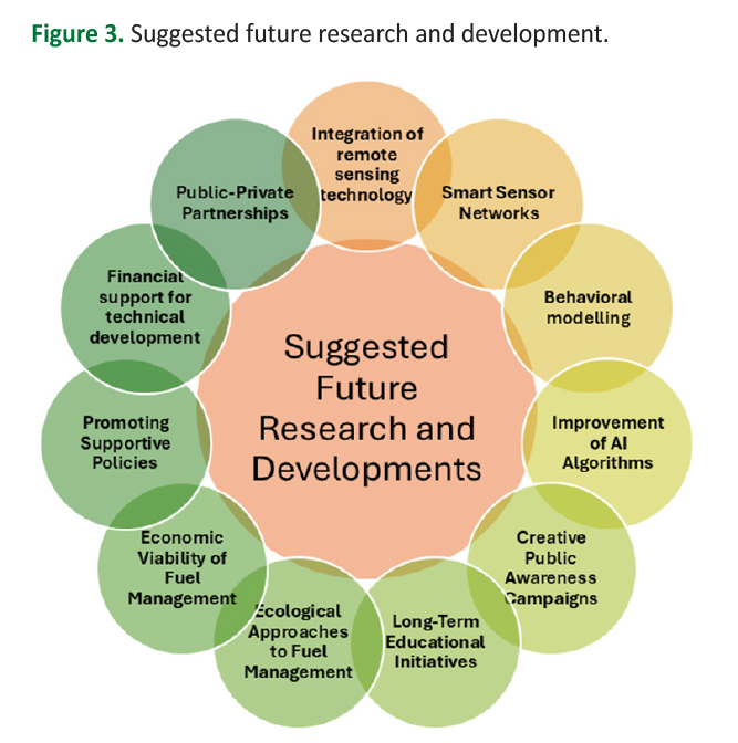 By addressing these research areas, future studies can significantly enhance wildfire prevention techniques, ensuring resilience and practical solutions to meet escalating wildfire risks. Supported by strong policies and collaborative efforts among stakeholders, these advancements will create a sustainable and effective framework for wildfire management.
