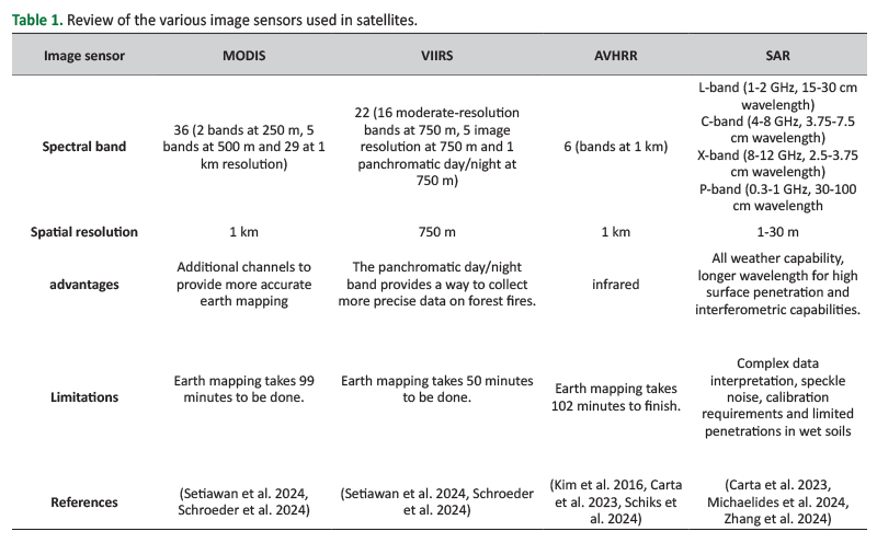 Recent technical developments have brought new instruments for detection, prediction, and reaction to wildfires, changing the management landscape. The fields of satellite technology and remote sensing are among the most promising for innovation. These technologies give authorities vital information on the health of the vegetation, moisture content, and fire behaviour, allowing them to properly monitor areas that are prone to wildfires. Modern sensors on satellites, like the Visible Infrared Imaging Radiometer Suite (VIIRS) (Schroeder et al. 2024, Setiawan et al. 2024) and the Moderate Resolution Imaging Spectroradiometer (MODIS) (Schroeder et al. 2024, Setiawan et al. 2024), make it easier to identify current fires and evaluate burned areas. This capacity is essential for comprehending the dynamics of fire and developing strategic reactions.