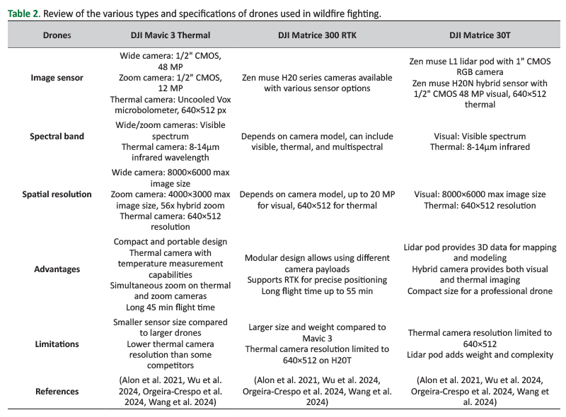 Table 2. Review of the various types and specifications of drones used in wildfire fighting.