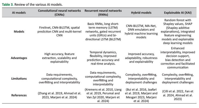 Table 3 shows various AI models used in wildfire prediction and prevention. Convolutional neural network systems (CNNs) are incredibly powerful image analysis tools, especially when it comes to the identification of wildfires using satellite imagery and aerial photographs. CNNs can automatically learn spatial hierarchies of features, which negates the need for manual feature extraction and allows them to identify complex patterns directly from raw data. CNNs can also learn from the data, which leads to significantly improved accuracy in image classification tasks, such as the identification of wildfires, often outperforming conventional detection methods. CNNs also operate well in unpredictable contexts, continuing to function even in the presence of unknown data. Applications like wildfire detection, where conditions might vary greatly and real-time analysis is necessary for efficient response and control, depend heavily on this robustness. CNNs are an effective method for detecting wildfires because they may improve forecast accuracy and dependability in the demanding and dynamic conditions by utilizing their strengths in image processing (Zhang et al. 2019, Ahmad et al. 2023, Marjani et al. 2024). Wildfire prevention and control is becoming more and more dependent on the application of recurrent neural networks (RNNs). Especially in conjunction with other machine learning approaches, RNNs offer robust tools for assessing wildfire risk data and enhancing detection strategies (Kremens et al. 2010, Liang et al. 2019, Perumal and Van Zyl 2020, Marjani et al. 2024). According to WEF (https://www.weforum.org/agenda/2023/09/ai-model-prevent-wildfires/) researchers from Finland's Aalto University developed the Fire CNN model, which is one noteworthy advancement. This model predicts locations at high risk for wildfires by analyzing weather data and satellite imagery using both convolutional neural networks (CNNs) and radial neural networks (RNNs). By simulating several land management techniques, such as turning shrubland into swamp forests and blocking drainage canals, the model has the ability to minimize wildfire occurrences by up to 76%. The use of hybrid artificial intelligence (Bui et al. 2016, Jaafari et al. 2019, Marjani and Mesgari 2023, Marjani et al. 2024) models is growing in the prevention and management of wildfires. These models combine different machine learning approaches to improve operational efficiency and predictive accuracy. These models analyze complicated datasets linked to wildfire risks and behaviours by combining several techniques, including convolutional neural networks (CNNs), recurrent neural networks (RNNs), and neuro-fuzzy systems. The application of explainable AI (XAI) in wildfire control is growing as a means of improving the interpretability of machine learning algorithms that forecast fire dangers. XAI assists in identifying important variables that influence the likelihood of wildfires, such as vegetation types and meteorological conditions, by revealing how models create predictions. A study that used a random forest model using Shapley values, for example, showed that it could detect high wildfire occurrence areas with 81.3% accuracy. It also highlighted important factors such as the Fire Weather Index and Normalized Difference Vegetation Index. Because of this openness, forest managers are better equipped to decide on fire control tactics, which eventually help to prevent and lessen wildfire disasters (Cilli et al. 2022, Ahmad et al. 2023, Fan et al. 2024).