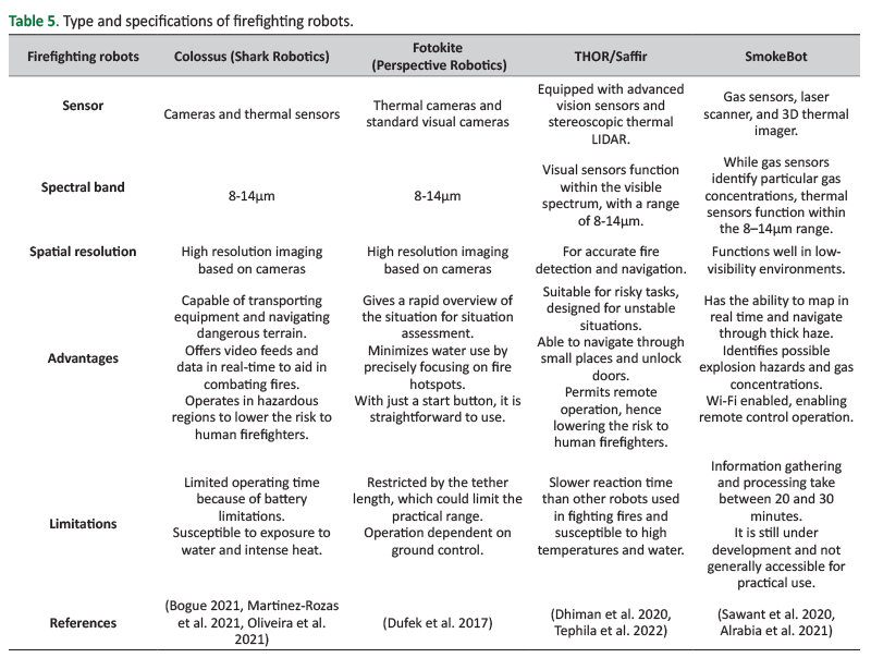 Human firefighters rely on firefighting robots developed in Japan to help them with dangerous and challenging tasks. Since these robots are well-equipped with a variety of sensors and firefighting devices, they can function in dangerous conditions like highly intense wildfires and toxic smoke (Guruprasad et al. 2020, Arora et al. 2023). Numerous firefighting robots are built to function independently. They can traverse over areas damaged by fires using sensors and algorithms, and they can collect and transmit data in real time, including temperature readings, smoke densities, and video feeds. These robots have fire suppression tools including foam dispensers, water cannons, and fire extinguishers installed. These robots can navigate challenging environments that are impossible for human firefighters to access, like rubble, steep inclines, and small places, thanks to advanced mobility technologies. Firefighters could remotely operate certain robots to facilitate coordinated efforts during rescue and firefighting operations (Guruprasad et al. 2020, Arora et al. 2023, Li et al. 2023, Talavera et al. 2023). Table 5 given below shows different types of firefighting robots and their specifications.
