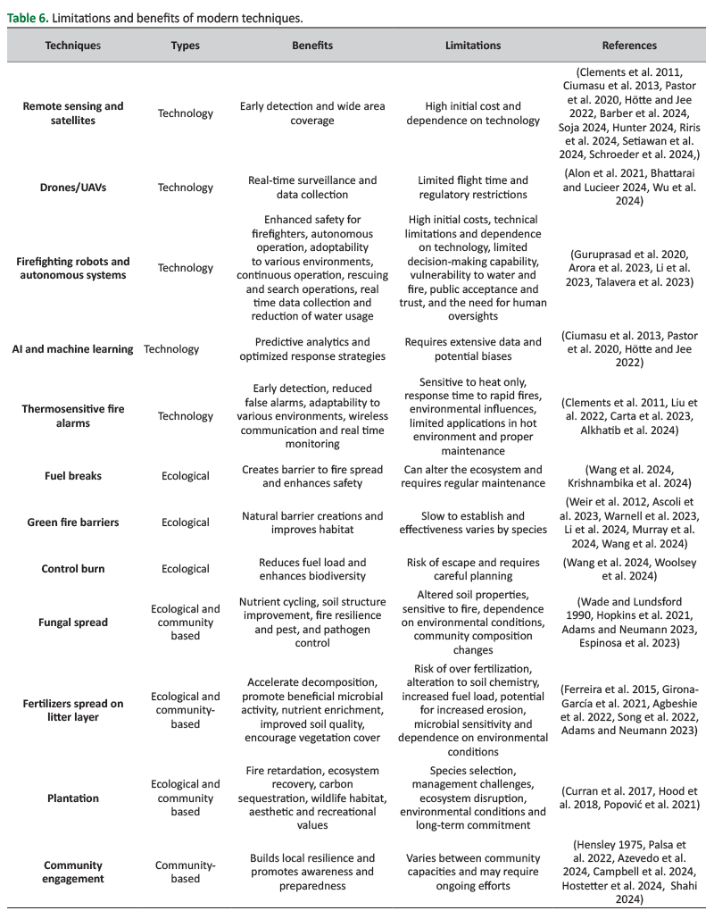 Therefore, a cooperative strategy that makes use of the advantages of both ecology and technology is required due to the complex nature of forest fire prevention. The use of innovative approaches, such as artificial intelligence (AI), drones, remote sensing, thermosensitive alarms, and community involvement, will be essential for reducing the effects of wildfires as the wildfire landscape becomes more complicated. The purpose of this review is to compile advantages and limitations of these cutting-edge strategies in order to highlight their efficacy and potential for use in the future to avoid forest fires.