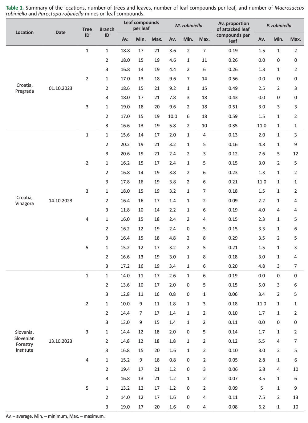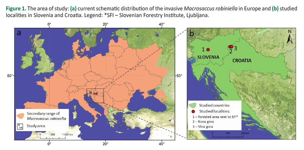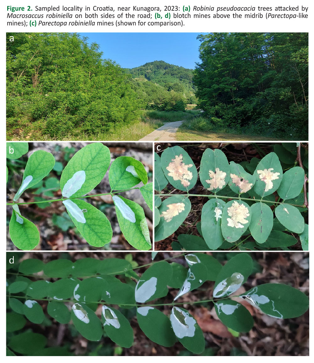 The North American Macrosaccus robiniella (Lepidoptera: Gracillariidae) is a leaf-mining moth trophically associated with North American black locust, Robinia pseudoacacia L. This tree was introduced to the European continent in the 17th century, and since that time it has widely spread in European countries, penetrating forested areas (Vítková et al. 2017). Outside its native range, M. robiniella was first documented in 1983 in Switzerland (Whitebread 1990). In the following decades, the leaf-miner spread across most of the European continent (Davis and De Prins 2011), including the European part of Russia (Baryshnikova 2019). In Slovenia, M. robiniella was detected in 1994 (Seljak 1995, Maček 1999), and in Croatia in 2001 (Mešić and Maceljski 2001). Alongside M. robiniella, black locust has been the host to another invasive leaf-mining moth, the North American Parectopa robiniella (Lepidoptera: Gracillariidae), which was first observed in 1983 in Slovenia and 2001 in Croatia (Maceljski and Igrc 1983, Maček 1984). These leaf-mining moth species are now distributed across both countries (Matošević 2007, Gomboc and Kirichenko 2022).