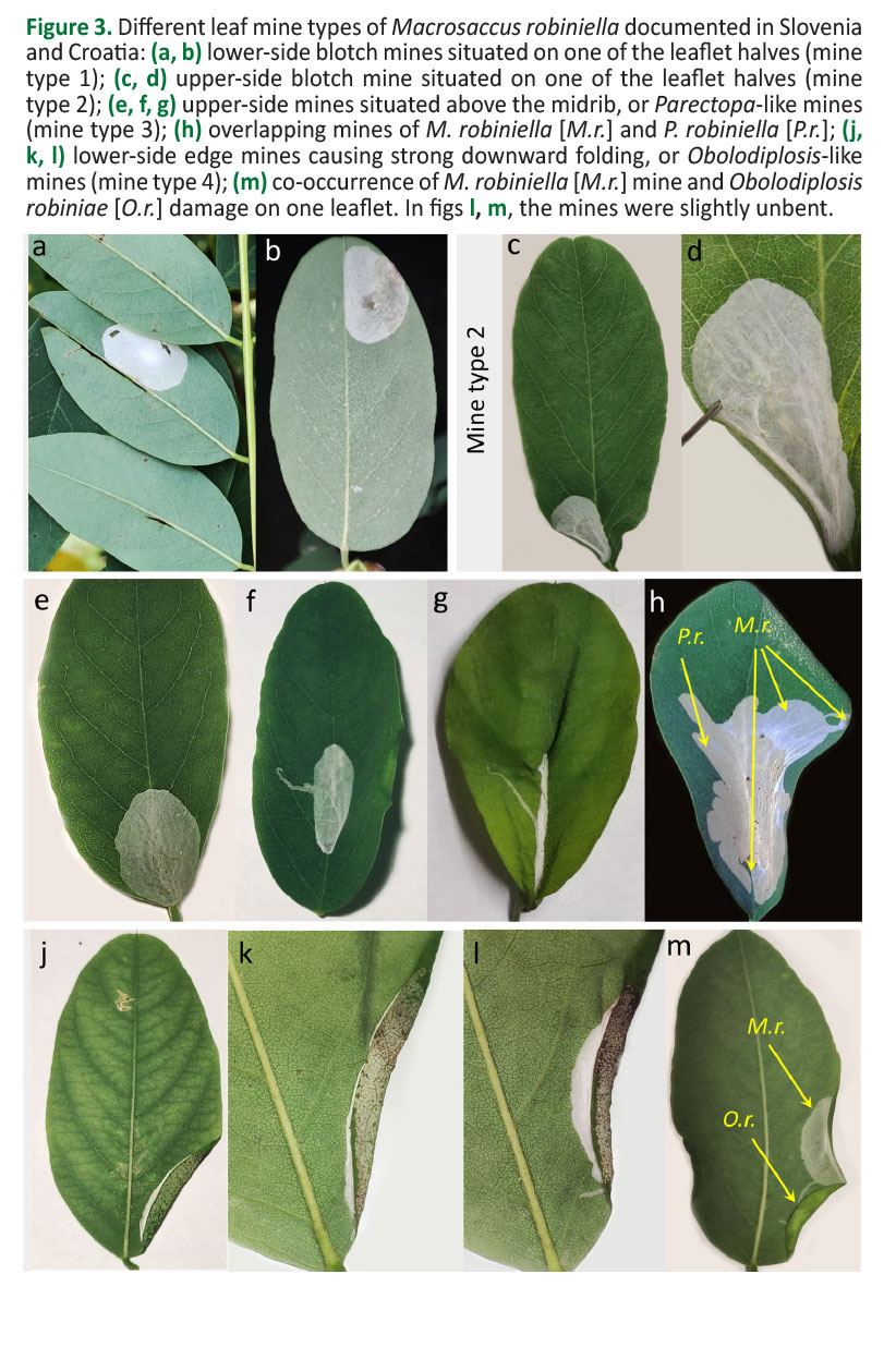 In 2019, in Slovenia in the forested area around the Ljubljana Castle (Ljubljana) and in Panovec forest (Nova Gorica), we observed that M. robiniella, in addition to its common mine type, was able to produce mines on the upper side of leaflets, occupying one of the leaflet halves (unpublished data). To our knowledge, in Europe, a single case of upper side mine was mentioned in Switzerland (Whitebread 1990). Opportunistic surveys conducted in 2023 revealed two other mine types with unusual positions on leaflets. Some mines were situated on the upper side above the midrib, similar to the mines of P. robiniella, whereas other mines were positioned at the leaf edge, causing strong downward folding, resembling damage caused by another North American insect, Obolodiplosis robiniae (Diptera: Cecidomyiidae). This was first recorded in Europe in 2003 in Italy (Duso and Skuhravá 2004) and is also present in both Slovenia and Croatia (Duso et al. 2005, Pernek and Matošević 2009).