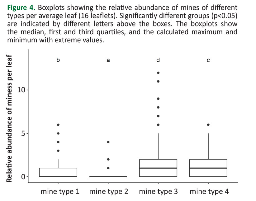 The highest relative abundance (median of 1.99 per leaf) was observed for mine type 3 (Parectopa-like mine), followed by mine type 4 (Obolodiplosis-like mine) (mean of 1.12 per leaf). Mine types 1 and 2 were the least abundant (mean of 0.53 and 0.14 per leaf, respectively), occurring about four times less frequently than mine types 3 and 4.