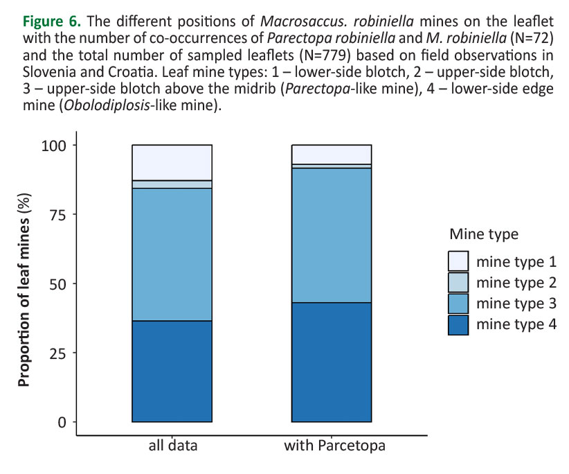 In their invaded range, M. robiniella and P. robiniella share the same localities, host trees and in some cases even the same leaflets (Fodor and Hâruţa 2009, Medzihorský et al. 2024). Until recently, M. robiniella was known for its lower side tentiform blotch mines (common mine type) occupying one of the leaflet halves, whereas P. robiniella always forms its mines over the midrib on the upper side of the leaflet. Thus, both species effectively shared the same trophic niche by occupying a certain side of the leaflet (Fodor and Hâruţa 2009).