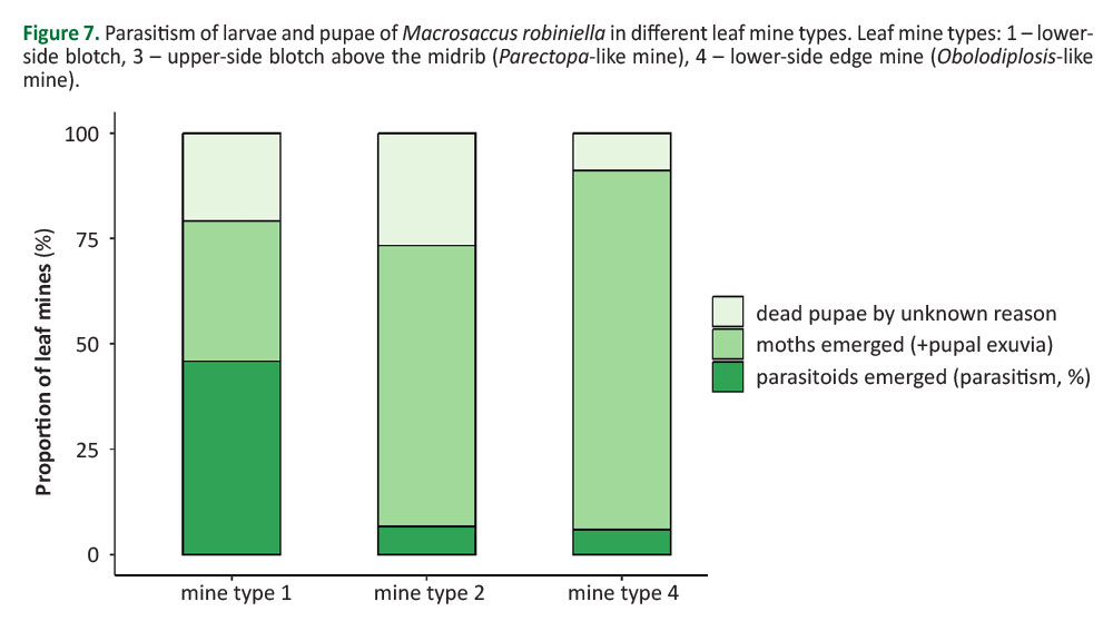 Parasitism was estimated for all mine types, except for upper-side blotch mines situated on one of the leaflet halves, as such mines were rarely observed. Up to 35 mines of the three most common types were randomly selected from the examined leaflets for parasitoid rearing (mine type 1: 34 leaflets; mine type 2: 15 leaflets; mine type 3: 24 leaflets). Only leaflets with a single mine type were used. When multiple mines were present, the target mine, along with a surrounding green area (5–10 mm around the mine), was excised from the leaflet. Leaflets with mines or the excised mines were individually placed in plastic Petri dishes (60 mm in diameter) to allow parasitoid adults to emerge. The dishes with the mines were kept indoors in stable conditions (23°C, 50% humidity) for one month. At the end of this period, the dishes were inspected, and the emerged parasitoids and moths were counted. Parasitoid adults were preserved in 96% ethanol, and moths were pinned for collections. Mines from which nothing emerged were dissected under an Olympus SZ51 stereomicroscope (Tokyo, Japan, Olympus Corporation). In these mines, the number of parasitoid pupae and dead M. robiniella larvae or pupae (without signs of parasitism) was counted. When the cause of larval and pupal death was not identified, these individuals were all categorized as “died from unknown causes”.