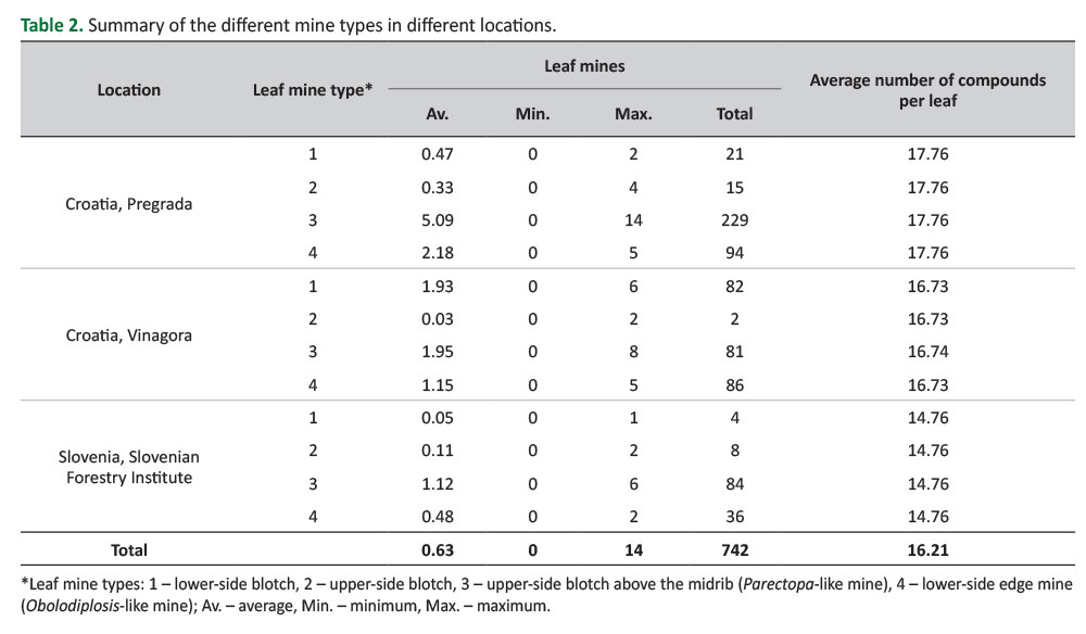 Four mine types were observed in M. robiniella in the studied forested areas in Slovenia and Croatia (Table 2).