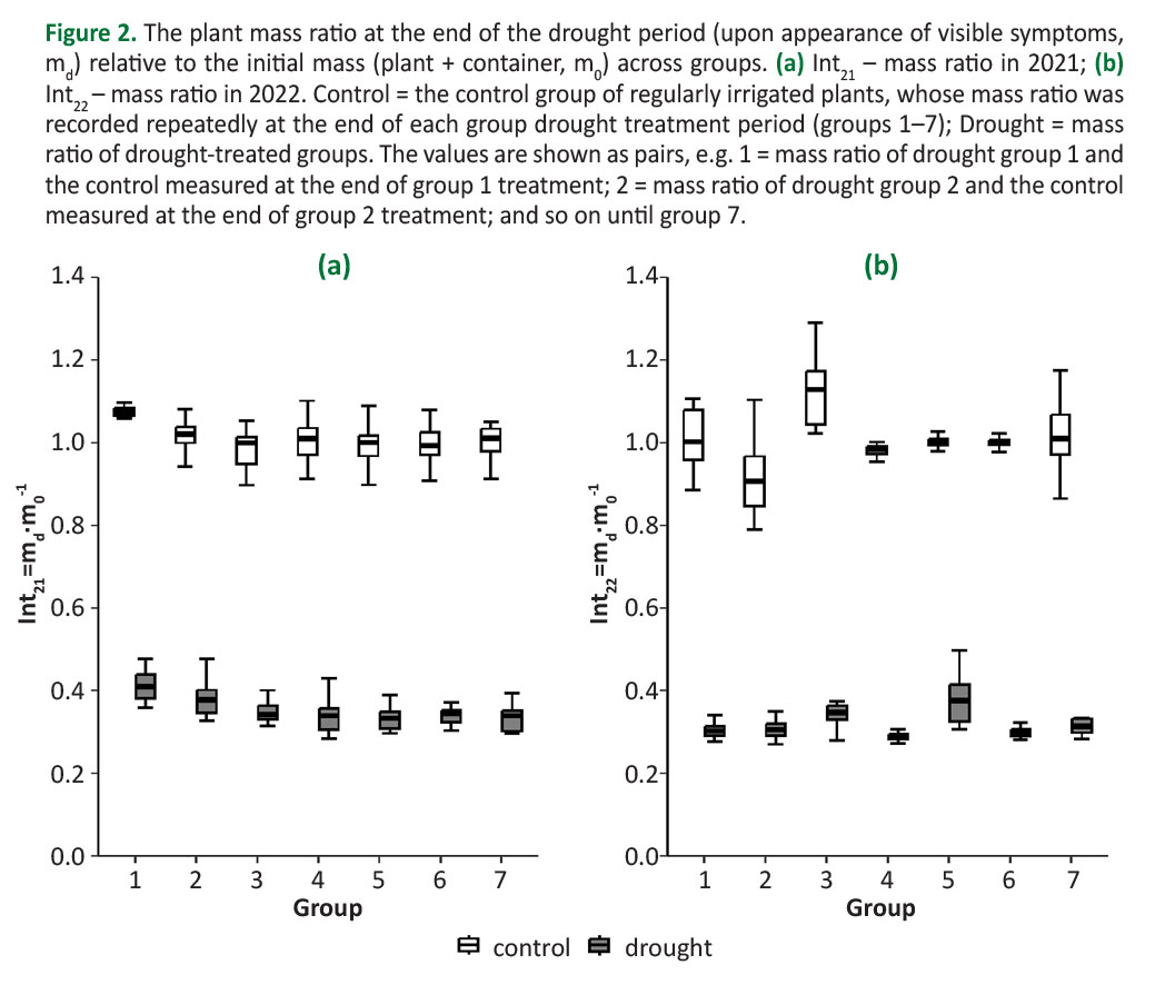The intensity of drought stress was calculated as the relative reduction in plant mass within the pots. For each ramet, we determined the ratio between the mass lost up to the point when clear drought stress symptoms were observed (marking the end of the stress period) and its initial mass under fully saturated conditions was obtained, as described by Bačurin et al. (2025).