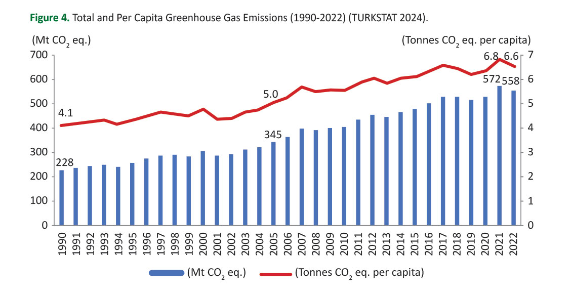 Figure 4. Total and Per Capita Greenhouse Gas Emissions (1990-2022) (TURKSTAT 2024).