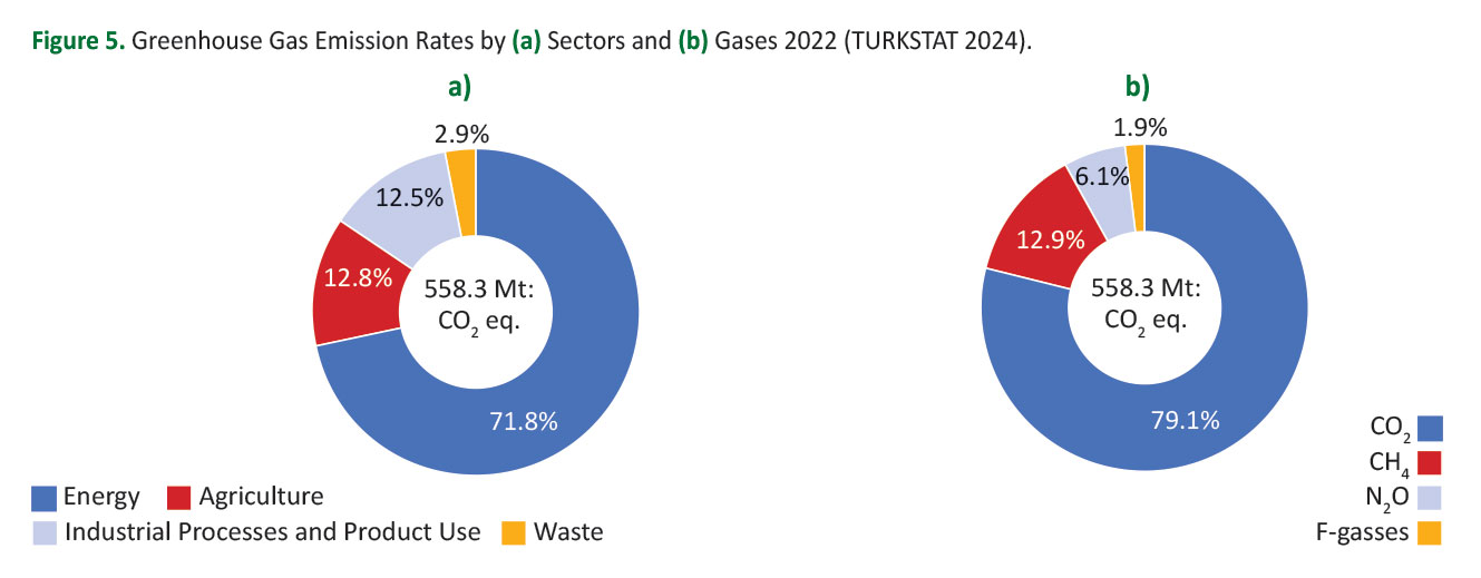 Figure 5. Greenhouse Gas Emission Rates by (a) Sectors and (b) Gases 2022 (TURKSTAT 2024).