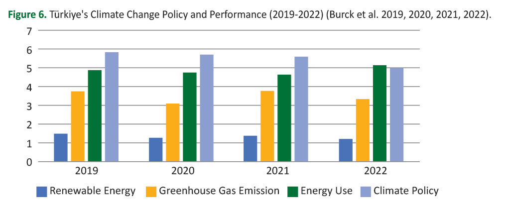 In Figure 6, Türkiye's reaction to climate change, the policies it has developed and its performance are measured. Scoring was made according to the parameters of renewable energy (20%), energy use/consumption (20%), climate policy (20%) and greenhouse gas emission (40%). According to the scoring system, very high, high, medium, low and very low categories were determined. In 2019, a total of 57 countries were included in the assessment and Türkiye ranked 50th with a score of 40.22 and was in the very low category (Burck et al. 2019). In 2020, when 58 countries were evaluated, Türkiye ranked 48th with a score of 40.76, but could not leave the very low category (Burck et al. 2020). In 2021, Türkiye scored 43.47 points and moved from the very low category to the low category. In the ranking created by analysing the data of 58 countries, Türkiye found itself in 42nd place (Burck et al. 2021). In 2022, 61 countries were evaluated, and Türkiye was again in the low category. However, Türkiye's score was 50.53 (Burck et al. 2022). These data and performance show that Türkiye is constantly improving itself in this field and is serious about adaptation to climate change. Türkiye has demonstrated this by preparing action plans, ratifying the Paris Agreement, accepting the 2030 target, and setting a net-zero emission target for 2053 with the National Contribution Declaration.