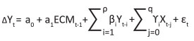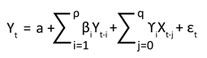 Here, p and q represent the number of lags of Y and X variables, respectively. Constant term, and are the parameters.
