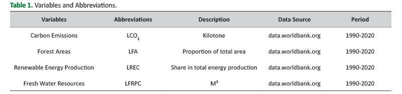 In the model, 't' represents time, 'LCO2' represents carbon emissions in kilo tonnes, 'LFA' represents forest areas within the borders of Türkiye, 'LREC' represents electricity generated from renewable sources, 'LFRPC' represents freshwater resources in Türkiye in cubic metres, and ɛt represents the error term. Freshwater resources in Türkiye are added to the study as a control variable to obtain more meaningful results. In the study, the coefficients between these variables will be estimated with the Autoregressive Distributed Lag (ARDL) estimator approach. The data range in the study covers the period 1990-2020 due to the last published data constraint, and the data consists of annual observations. The data used in the study were obtained from the World Bank databases. In addition, natural logarithms of the data are used.