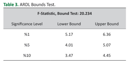 As shown in Table 3, the F-statistic obtained from the ARDL bounds test is 20.234. This value is considerably higher when compared to the critical bounds determined for different significance levels. At the 1% significance level, the lower bound is given as 5.17 and the upper bound as 6.36. According to these results, the F-statistic exceeds the upper bound for both the 1% level and even lower significance thresholds.