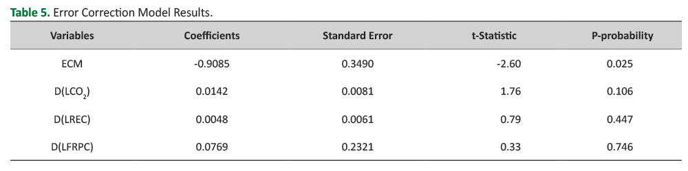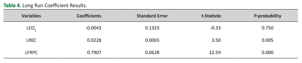 Regarding the short-run variables, the coefficient for the D(LCO2) variable is 0.0142, the t-statistic is 1.76, and the p-value is 0.106. Although this shows that CO2 has a positive effect on the dependent variable in the short run, this effect is not considered statistically significant since it is above the 10% significance level. The coefficient of D(LREC) variable is 0.0048, the t-statistic is 0.79, and the p-value is 0.447. These findings indicate that LREC has no significant effect on the dependent variable in the short run. Similarly, the coefficient for the D(LFRPC) variable is 0.0769, the t-statistic is 0.33, and the p-value is 0.746. This reveals that LFRPC has no significant effect on the dependent variable in the short run.