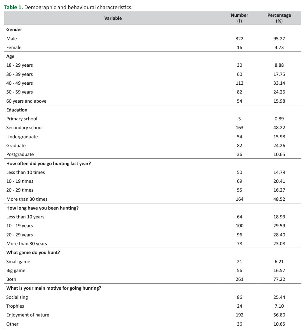 The respondents’ engagement in hunting activities is reflected in the frequency of their participation: in the past year, 85.21% of the respondents reported going hunting more than 10 times, and 48.52% reported more than 30 hunting trips. These findings indicate a high level of hunting activity, which exceeds the results from a Danish study in which 70% of the respondents hunted more than 10 times annually (Therbo and Von der Osten 2008, 2009). Regarding hunting experience, the respondents were relatively evenly distributed across different durations of hunting activity. The largest group (29.59%) had been hunting for 10 to 20 years, while 23.08% had over 30 years of experience. Comparable data from a Croatian study showed that 73.1% of the respondents had been hunting for more than 11 years, and 14.2% for more than 30 years (Sudarić et al. 2022). In Sweden, 40% of hunters had more than 30 years of experience (Junuzovic et al. 2013). Most participants in our study reported hunting both small and big game. The primary motivation for hunting, cited by 56.80% of the respondents, was enjoyment of nature. This finding contrasts slightly with that of Sudarić et al. (2022), where socialising was the most frequently reported motive among hunters in eastern Croatia, followed by enjoyment of nature. In both studies, trophies and meat were the least cited reasons for hunting.