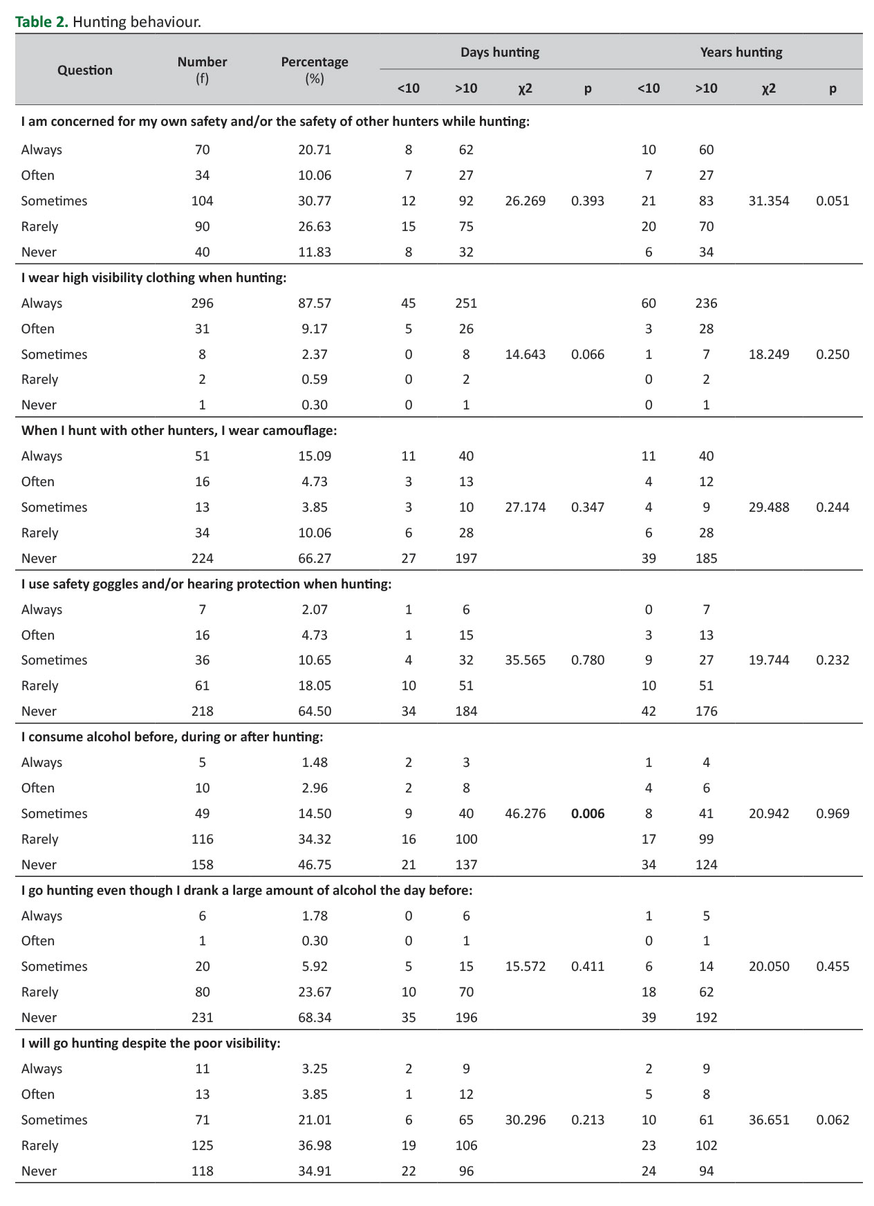 Respondents were concerned to some extent about their own safety and the safety of others when hunting. Only 11.83% of the respondents stated that they had never been concerned about their own safety and the safety of others when hunting, which is less than in a study conducted by Therbo and Von der Osten (2008) in Denmark, in which 30% of the respondents stated that they had never been concerned about their own safety and the safety of others when hunting. A statistically marginal difference was observed between respondents with less than 10 years of hunting experience and those with more than 10 years (p = 0.051). This difference appears to stem from the fact that more experienced hunters expressed a slightly higher level of concern for their own safety as well as the safety of other participants in the hunt.