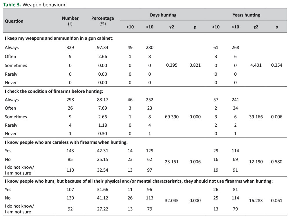 Additionally, 42.31% of the respondents reported knowing individuals who behaved carelessly with firearms during hunting. A statistically significant difference was observed between respondents who had gone hunting fewer than 10 times in the past year and those who had hunted more frequently (p = 0.006). This difference may be explained by the fact that more frequent hunters are exposed to a larger number of individuals, increasing the likelihood of encountering unsafe firearm behaviour. A similar pattern was reported in Sweden, where 35% of the respondents stated they had witnessed others handling firearms carelessly (Junuzovic et al. 2013). Furthermore, 31.66% of the respondents in our study reported knowing individuals who, due to physical or mental characteristics, should not be permitted to use firearms for hunting. This proportion is considerably higher than that recorded in Sweden, where only 16% of the respondents identified such individuals (Junuzovic et al. 2013). As with the previous question, a statistically significant difference (p < 0.000) was found between respondents who hunted fewer than 10 times in the last year and those who hunted more frequently.