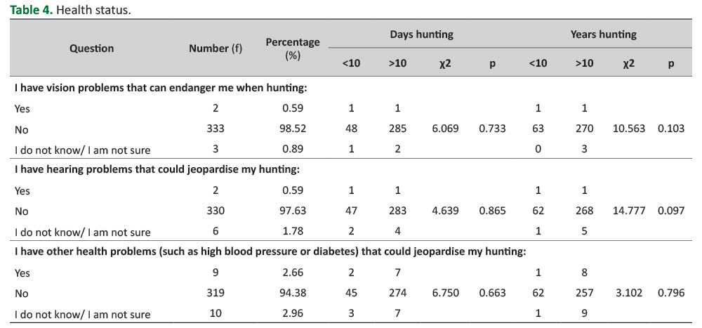 The majority of the respondents in Croatia reported being in good health, which suggests that health limitations are not a common barrier to participation in hunting. Specifically, 98.52% of the respondents reported no vision problems, 97.63% reported no hearing problems, and 94.38% reported no other health issues that could affect hunting activities. These figures contrast markedly with those reported in Sweden, where 44% of hunters stated they had vision problems, 30% reported hearing problems, and 17% reported cardiovascular conditions, most commonly hypertension (Junuzovic et al. 2013). One possible explanation for these discrepancies lies in the age difference between the two samples: the average age of respondents in our study was 46 years, compared to 54 years in the Swedish study.