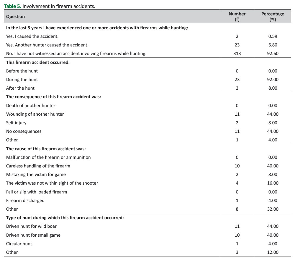 In our study, 7.40% of the respondents (n = 25) reported witnessing a hunting accident in the past five years. Among them, two respondents admitted to causing the accident themselves, while 23 reported witnessing an accident caused by another hunter. These figures are somewhat higher than those reported in Denmark, where 71 out of 1797 respondents (3.95%) had been involved in or witnessed a hunting accident in the last 5 years; 32 had been involved and 39 had witnessed the accident (Therbo and Von der Osten 2009). Notably, the Swedish study reported significantly higher rates: 5% of the respondents had personally caused an accident, and 23% had witnessed one caused by another hunter (Junuzovic et al. 2013).