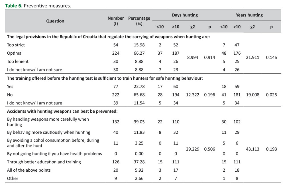 In conclusion, hunting safety depends on a combination of individual responsibility, hunting frequency, the quality of training, and the effectiveness of legal regulations. Continuous improvement of training and regular reinforcement of safety measures, targeted not only at beginners but also at experienced hunters, is necessary.