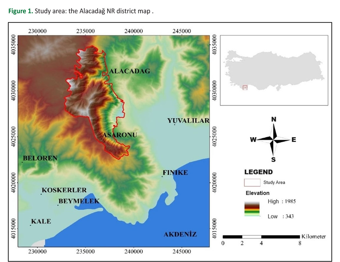 Most of the mountains seen in a rugged structure in the area are in the form of an extension of the Western Taurus Mountains, and the highest point of the area is the Alacadağ with a height of 2,302 m (Öner and Vardar 2018). According to the Thornthwaite method (1948), the moisture effective index (Im) in the Alacadağ region has been determined to be 24.21. Based on this value, the prevailing climate type and precipitation effectiveness class in the region were characterized as “humid”.