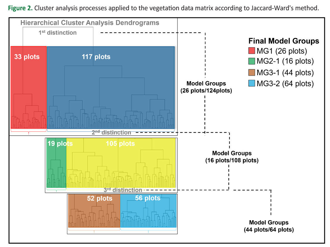 In vegetation classification studies, firstly, the recording of information on plant species (presence-absence or cover-abundance) is carried out according to the coordinates of the sampling sites through inventory studies in the forest area. To ensure the correct classification of vegetation, the execution of an accurate and successful inventory process is the most basic start (Grossman et al. 1998). In most studies on this subject, Braun-Blanquet (1932) method has been preferred (Chytrý and Otýpková 2003, Willner et al. 2009). Flora inventory data collected from different site conditions—once recorded manually—are now digitized and processed numerically, serving as a crucial input for vegetation classification. While analytical methods such as ordination and cluster analysis have long been used in phytosociology, the advent of computer-assisted multivariate techniques has significantly accelerated the analysis process and enabled the handling of large and complex datasets (De Cáceres and Wiser 2012). Thanks to these techniques, vegetation classification can be conducted hierarchically, while simultaneously identifying the distinctive plant species that are influential at each stage (Özkan et al. 2021). The most basic alternative methods that can be used to create vegetation groups objectively and analytically are association analysis (Williams and Lamberg 1959), cluster analysis (Pritchard and Anderson 1971) and two-way indicator species analysis (Hill 1979). These methods differ from each other by the use of alternative distance measurement formulas and by the detailed information they present in the result dendrograms.