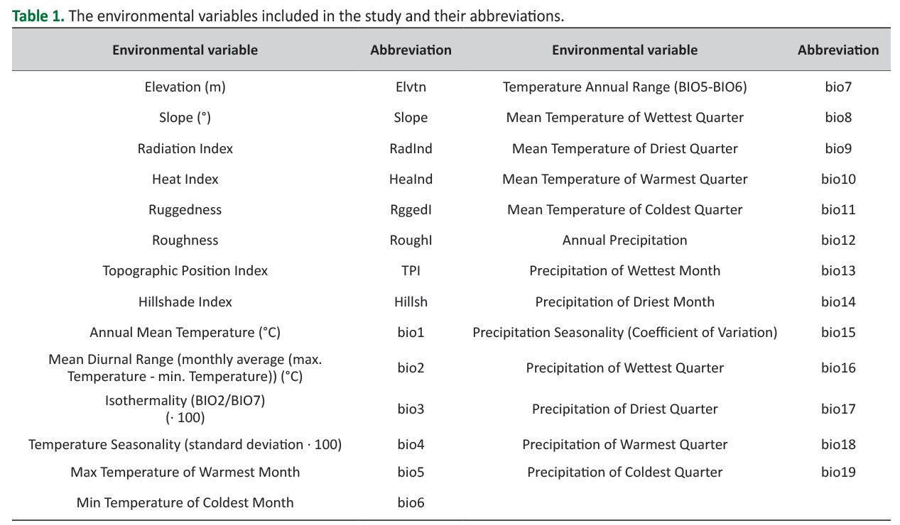 In the study, a Pearson correlation analysis was initially conducted to identify descriptive variables with high correlation (r > 0.85) that could lead to multicollinearity issues in the models. As a result of the analysis, all climate variables except for bio2 and bio12 were found to be highly correlated with elevation (Elvtn). Therefore, a total of 10 variables were chosen for the modeling processes: 8 topographical (Elvtn, HeaInd, Hillsh, RadInd, RoughI, RggedI, Slope, TPI) and 2 bioclimatic (bio2, bio12).