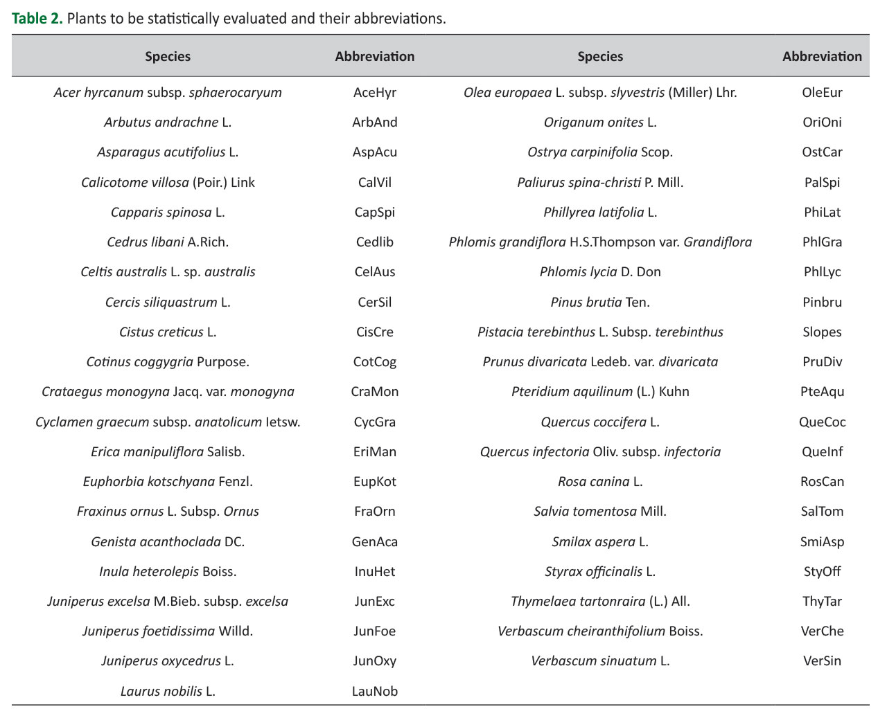 Table 2. Plants to be statistically evaluated and their abbreviations.