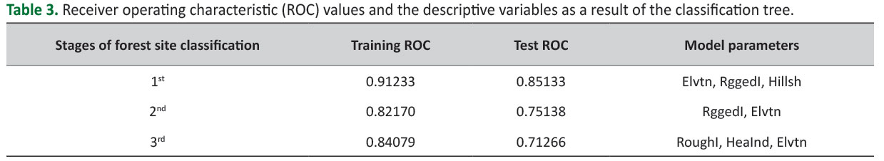 According to the cluster analysis applied based on the hierarchical vegetation distinction, the vegetation classification of Alacadağ NR was completed in 3 stages. The vegetation groups obtained by cluster analysis were modeled with the classification tree technique with environmental variables as dependent variables at each distinction stage. The ROC (receiver operating characteristic) values of the training and test data sets at each distinction stage and the descriptive variables in the models are given in Table 3.