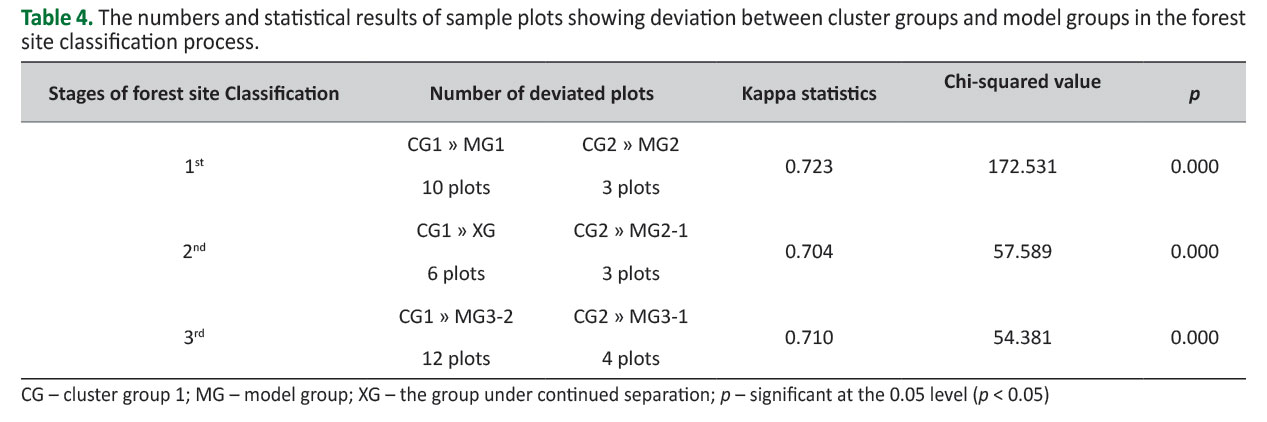 Cohen's kappa statistics, chi-square values, and their significance levels (p < 0.05) calculated based on the number of sample plots that have deviated and shifted between the vegetation groups obtained from the cluster analysis and the model groups formed as a result of the modeling analysis are presented in Table 4.