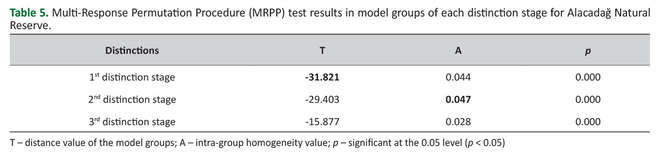 Then, a Multi-Response Permutation Procedure (MRPP) test was used to determine intergroup distance (T) and intragroup homogeneity (A) values in these model groups at each distinction stage (Table 5).