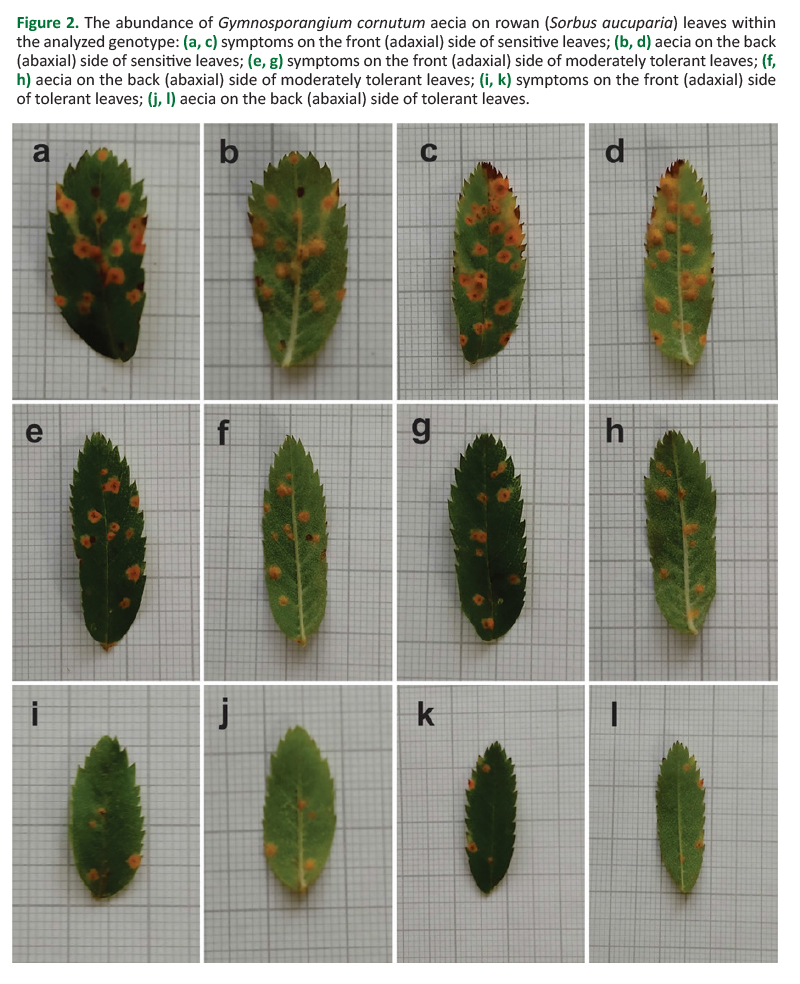 In accordance with the above, the objective of this research was to examine whether genotypic and morphological variability of Sorbus aucuparia leaves influences the development of rust caused by Gymnosporangium cornutum. The tested null hypotheses were: I) Sorbus aucuparia genotype does not influence the occurrence of Gymnosporangium cornutum aecia; II) Sorbus aucuparia leaf dimensions do not affect the occurrence of Gymnosporangium cornutum aecia; III) In the case of the sensitive genotype of Sorbus aucuparia, there is no difference in abundance of Gymnosporangium cornutum aecia on leaves of different dimensions.