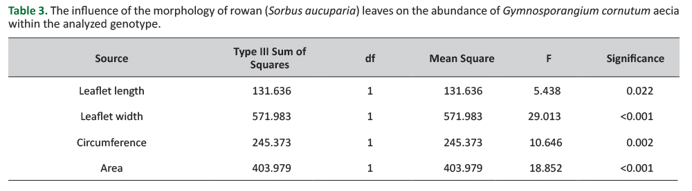 A general linear model (GLM) was used to test differences in the average Gymnosporangium cornutum aecia values across Sorbus aucuparia leaf dimensions. Pearson’s correlation was used for the analysis of a link between the Sorbus aucuparia leaf dimension and the number of Gymnosporangium cornutum aecia.