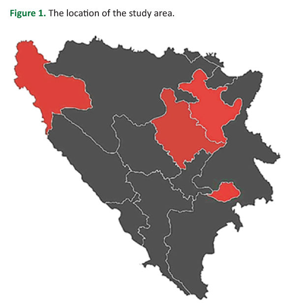 The research was carried out during the summer of 2024, encompassing different parts of the Federation of Bosnia and Herzegovina, including Una-Sana Canton (Cantonal Public Enterprise “Unsko-sanske šume“ Ltd. Bosanska Krupa), Tuzla Canton (Cantonal Public Enterprise “Šume Tuzlanskog kantona“ Ltd. Kladanj), Bosnian-Podrinje Canton (Cantonal Public Enterprise “Bosansko-podrinjske šume“ Ltd. Goražde) and Zenica-Doboj Canton (Cantonal Public Enterprise “Šume Zeničko-dobojskog kantona“ Ltd. Zavidovićima) (Figure 1).