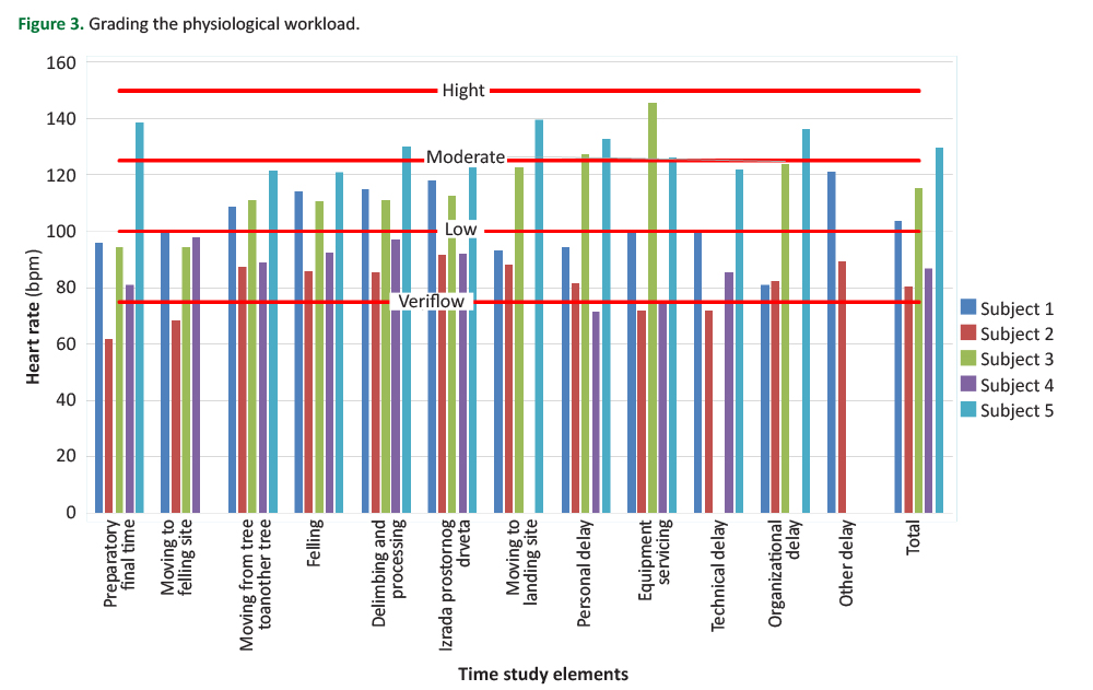The highest physiological workload in this study was recorded during equipment servicing (76.97%), dealing with a hung-up tree (56.26%), delimbing and processing (50.65%) and moving to the landing site (54.45%). The lowest physiological workload was measured during the organisational delay (22.05%) for subject 1, preparatory-final time (7.24%) for subject 2, preparatory-final time and moving to felling site (both 22.10%) for subject 3, personal delay (9.63%) for subject 4 and felling (38.15%) for subject 5. Cheţa et al. (2018) found that the lowest physiological workload was during work preparation (21.76%) and the highest was during technical delay (57.49%).
