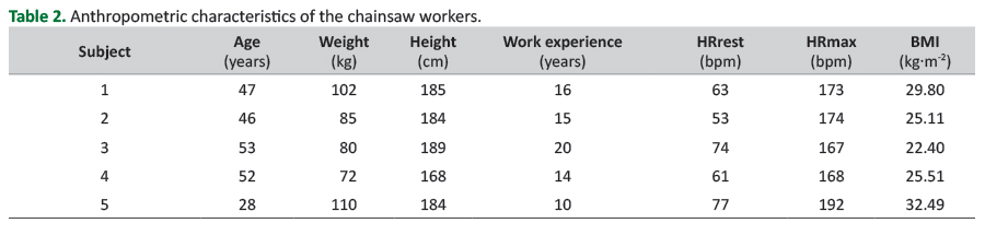 Table 2. Anthropometric characteristics of the chainsaw workers.