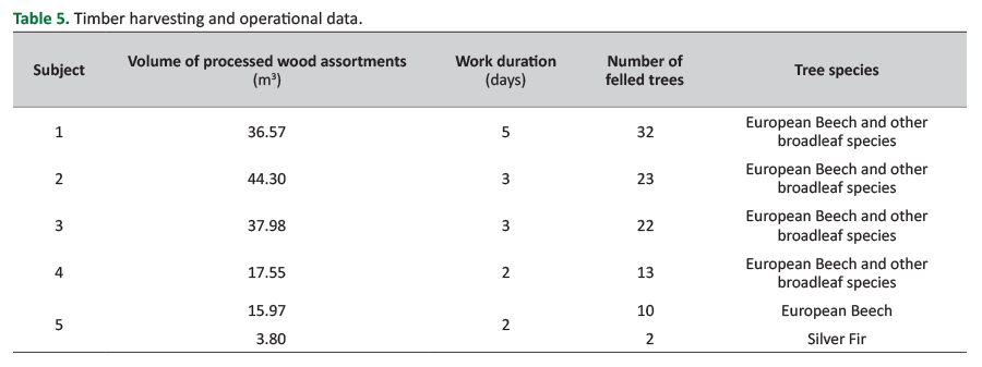 The operational data and harvesting statistics are summarised in Table 5. A total of 102 trees were harvested over a period of 15 working days. The species composition of the harvested timber primarily consisted of European Beech and other broadleaf species. Initial analysis of the harvesting data indicates a total wood volume of 156.17 m3, with a daily output that varied across the different forest compartments.