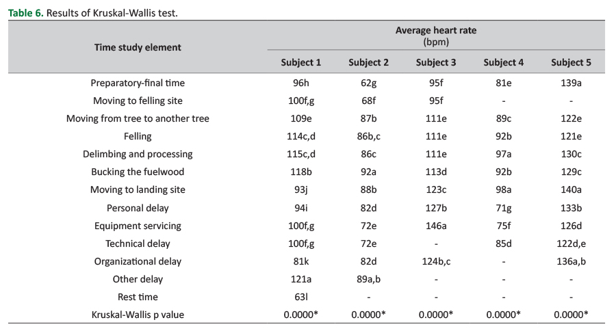 The non-parametric Kruskal-Wallis test was used to determine the differences between the average heart rates for various time study elements (Table 6). Post hoc cross-comparisons between average heart rates were performed using Tukey´s test. Results showed a statistically significant difference in average heart rate in relation to the time study element (p=0.0000).