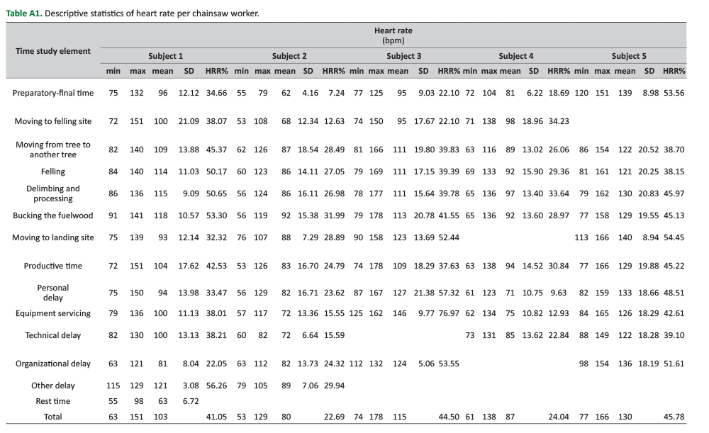 Table A1. Descriptive statistics of heart rate per chainsaw worker.