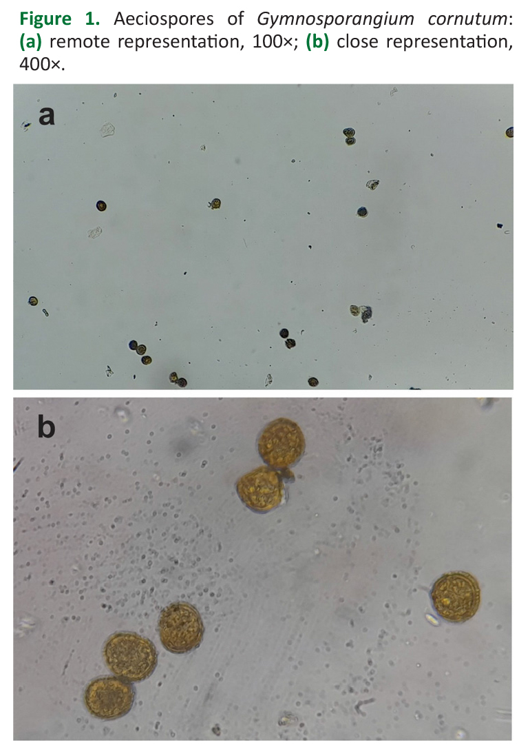 Ten rowan (Sorbus aucuparia) trees, 7-8 years old, were sampled on the site Bukovica, Montenegro. The distance between the trees was 20 m. The presence of rust caused by Gymnosporangium cornutum was confirmed by the presence of aecia. The aeciospores were 20-30 × 18-25 µm, and the aecia were 4-5 mm, within standard dimensions (Figure 1, Figure 2), matching the description of Ellis and Ellis (1985).