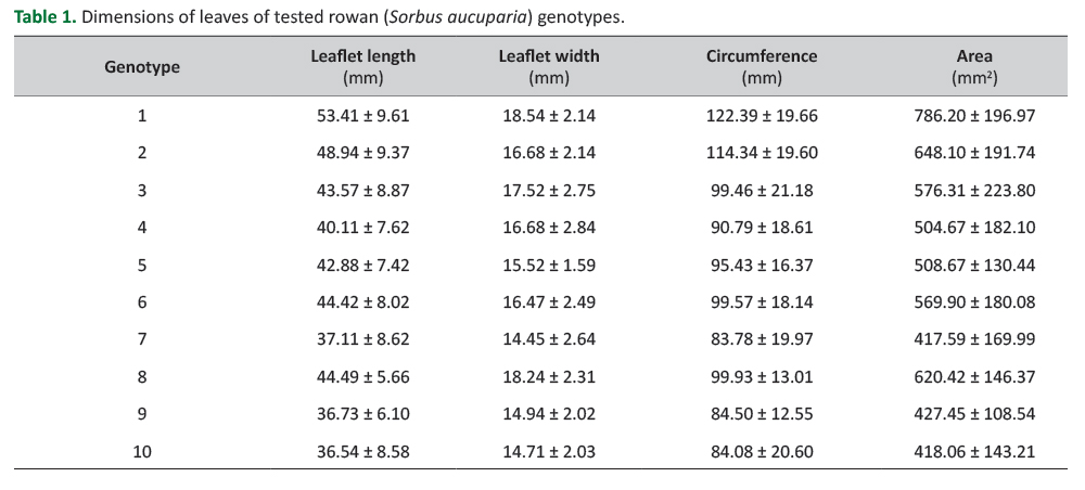 Table 1.Dimensions of leaves of tested rowan (Sorbus aucuparia) genotypes.